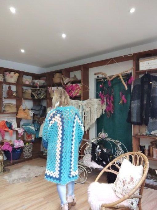 Veste Pearly crochetée pièce et modèle unique dans des teintes turquoise crème bleu nuit